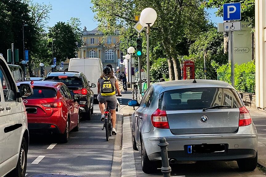 Insofern ist der Hinweis auf die Alternativrouten Rheinufer und Kaiserstraße nicht stichhaltig. Der DTV, der durchschnittliche tägliche Verkehr, beträgt auf der Adenauerallee rund 21.000 Kfz und 3.500 Radfahrende pro Tag, letzteres mit steigender Tendenz. Schließlich ist die Strecke auch der direkte Weg vom Zentrum in Richtung Museumsmeile und Bundesviertel. Die Wegnahme eines Fahrstreifens für den Pkw-Verkehr hätte eigentlich kaum Auswirkungen, da der sich ohnehin durch das Nadelöhr Koblenzer Tor zwängen muss.